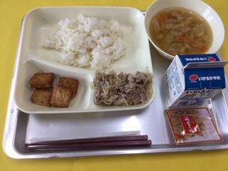 今日の給食は 豚肉ともやしの炒め物 すまし汁 あつあげのしょうがじょうゆかけ ご飯 牛乳 の献立でした。全体に、暑い夏に食べやすい、あっさりとした風味の献立にまとまっていました。今日を入れて1学期は6回の給食です。もうそんな時期になりました。明日からは懇談が始まり、いよいよ1学期のまとめです。
