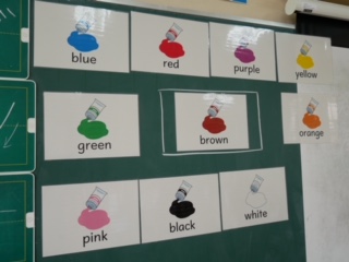 1年生が英語にふれる活動をしていました。ネイティブスピーカーの英語助手の先生の授業です。頭に手をやっています。はて、何をするのかな。英語助手の先生が色をあらわす英語を話し、指定された色の時に、机の上の消しゴムを取り合うというゲームです。「今回はorange」と言われると、別の色の時には動きません。black、blue、red、orange。さあ、反応できたかな。