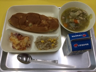 1学期さいごの給食は 鶏肉とテボ豆のスープ じゃがいもとトマトのチーズ焼き もやしとコーンのソテー おさつパン 牛乳 の献立でした。洋風の味つけにおさつパンの優しい甘みがとてもよく合っていて、満足感の高い1学期さいごの給食でした。