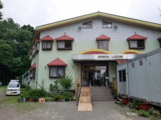 丘の上のグリーンロッジ正面玄関です。正面玄関横には烏骨鶏(うこっけい)さんとアヒルさんがいます。昨年度お邪魔した時よりずいぶん数が増えています。グリーンロッジ横には草原が広がっていて、キャンプファイヤー場が子どもたちが来るのを待ってセッティングされています。楽しいキャンプファイヤーになりますように。
