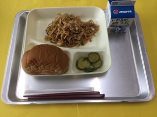 8月の全4回の給食のうち3回目です。今日の給食は オイスターソース焼きそば きゅうりのピリ辛あえ ハーフ黒糖パン 牛乳 の献立でした。今日の配布プリントでもお知らせしていますが、予定されていたソフト黒豆の提供が急遽中止となりました。残念です。