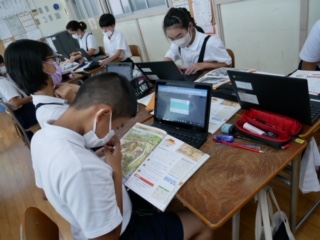 当たり前のように抵抗なく使っている光景はこのように6年生だけではなく、どの学年でも見られます。たいしたものだなと思いますし、黒板とチョーク、ノートと鉛筆、そして先生手づくりの紙の貼りものや資料、グループでは模造紙にまとめる‥そんな学習風景はもはやずいぶんと過去のことなんだとある意味寂しくもなります。教室の風景は変わりました。