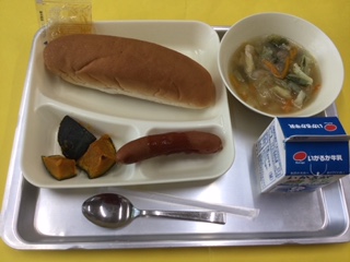 今日の給食は ウインナーのケチャップソース スープ 焼きかぼちゃ コッペパン マーマレード 牛乳 の献立でした。スープにはキャベツ タマネギ サンド豆 ニンジンがたっぷり入っていて食べ応えがありました。ウインナーもまた大きなサイズで食べ応えがありました。今日も感謝です。