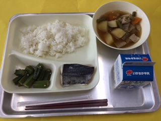 今日の給食は さごしの塩焼き 豚肉とじゃがいもの煮物 オクラの炒めもの ごはん 牛乳 の献立でした。煮物もいわば豚肉の肉じゃがなので、安心の和定食という感じです。ほっこりと落ち着いて食べることができました。