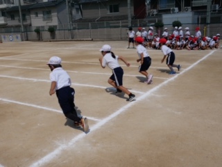 1年生がかけっこの練習をしていました。1年生なので距離は20mと短いですが、こうして写真を見ると、なかなか力感あふれるフォームです。本番さながらに「頑張れ」の声援がとんでいました。