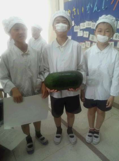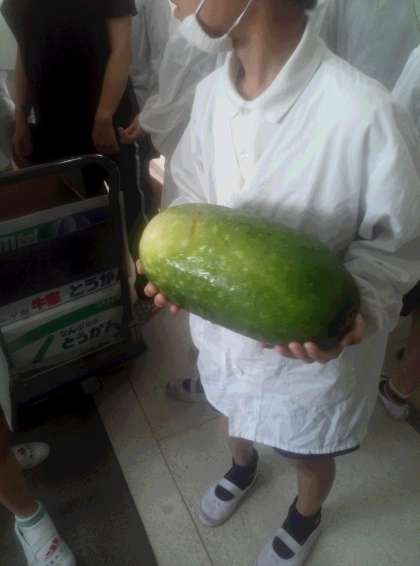 冬瓜(とうがん)がでます。そこで、給食委員会の皆さんが冬瓜をもって各教室をまわりました