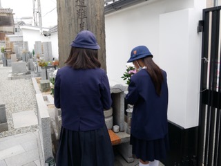 今日、9月21日は姫島小学校が毎年「慰霊祭」をおこなっている日です。88年前の昭和9年9月21日に大阪湾を北上した猛烈な勢力の「室戸台風」が西淀川区を直撃し多数の犠牲者を出しました。姫島小学校でも木造の校舎が暴風で倒壊し、その下敷きになった13名の児童、保護者、教職員が犠牲になりました。「慰霊祭」はそのことを語り継ぎ、犠牲者を悼んで全校児童と教職員で黙とうをおこなう取り組みです。放送での校長講話の後、代表児童が霊園につくられた慰霊碑にPTA代表、地域の代表の方、教職員代表の校長とともにお参りをしました。