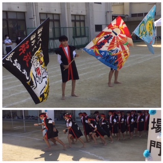 運動会事前練習の総仕上げとして、6年生が当日に演舞を観ることができない1年生、3年生、5年生たちの前で「ソーラン節」のお披露目会を行いました。まったく本番と同じです。衣装を着用して学級旗がはためきます。少し緊張もあってかみんなとても引き締まった表情。ソーラン節にのせて迫力ある、キレのある演舞を披露しました。