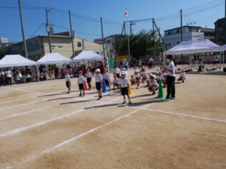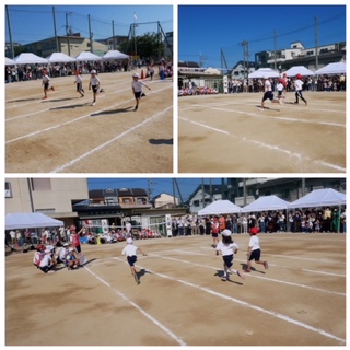 小学生になって初めての運動会。スタートをまっている表情が緊張しています。みんなとっても頑張って走っていましたよ。