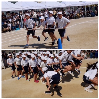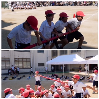 4年生の団体競技は台風の目。これも定番の競技ですが面白いです。長い棒をもってぐるりと回る、棒の上をみんなで飛び越える、みんなの頭の上に棒を通す。みんなで息を合わせることが何よりも大切です。4年生も練習でみたときよりずいぶんと上手になっていました。