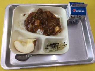 今日の給食は ハヤシライス キャベツのひじきドレッシング りんご 牛乳 の献立です。いつもはとろみをつけるために小麦粉のルウを使うのですが、今日はアレルギーに配慮して米粉を使っているとのこと。細やかな配慮に感謝です。