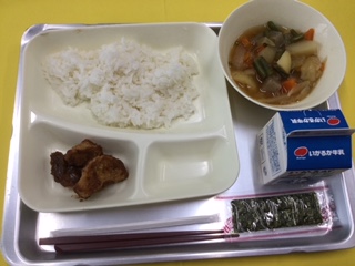今日の給食は みそカツ じゃがいもと野菜の煮物 焼きのり ご飯 牛乳 でした。