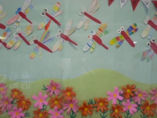 10月になって正面玄関の掲示物が新しくなりました。飛び交う赤とんぼです。大阪市内ではなかなか見かけなくなりましたが、秋の夕暮れに赤とんぼに囲まれてみたいと思いました。