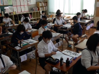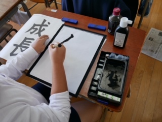 3時間目に校舎を巡回していると5年生が毛筆習字に取り組んでいました。「成長」。5年生みんなで書くのに書きがいのある文字です。先生が大きな筆に水を含ませて黒板にお手本を示します。一画一画それをまねてていねいに書いていきます。普段なかなか毛筆で書く機会はないと思うので、学校の習字の時間に経験するのはよい機会と思います。