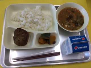 今日の給食は 和風ハンバーグ みそ汁 かぼちゃのいとこ煮 ごはん 牛乳 の献立でした。いとこ煮は、小豆と根菜類を甘しょっぱく煮た料理でお祝い事で出されることも多いそうです。かぼちゃと小豆のほっくりとした食感と甘味が秋を感じさせました。