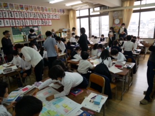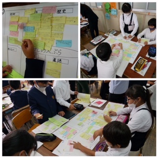 今日の5時間目に、大学から指導の先生を招き、4年生で国語の研究授業を行いました。「ふるさとの食を伝えよう」という単元で、最終的には「おおさかのおすすめの食べ物」を伝えるリーフレットの作成に結びつける学習です。今日の授業では班ごとに決めた「おすすめの食べ物」について前時までに集めた情報(を記したふせん)を班のワークシートに対話をしつつ貼りかえて情報の整理と取捨選択をおこなうことが中心でしたが、とても活発に楽しそうに話し合い活動を進めていたことが印象的でした。