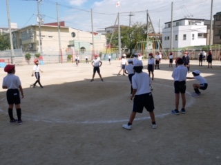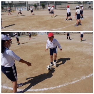 運動会が一段落して、校長室のすぐ横の運動場から元気な声がきこえてくる場面が先週、今週と少なくなっているのですが、今日は楽しそうな声に誘われて3年生の体育のようすを見に行きました。サッカーです。基本的なパスの仕方を練習した後、ステップアップして円陣パスにチャレンジ。足を使うので手でパスをするのとは勝手がちがいます。ボールをけるのは楽しいな。思い通りにコントロールできるようになればもっと楽しいぞ。