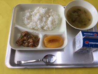 今日の給食は ピリ辛丼(写真は具材をかける前の状態です) 中華スープ 黄桃(缶詰) 牛乳 の献立です。トウバンジャンやみそをきかせた味つけがごはんと相性良く、パクパクと食が進みます。ピリ辛といいながらさほど辛味は感じませんでしたが、どうだろう。辛く感じた子どもたちもいたのかな。