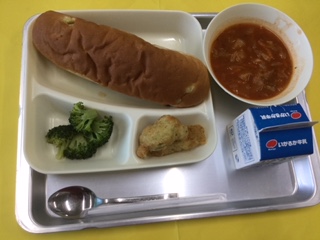 今日の給食は 白身魚のフリッター ミネストローネ ブロッコリーのサラダ おさつパン 牛乳 の献立でした。フリッターはふわふわの食感です。