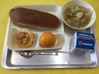 ?今日の給食は ぶた肉と野菜のスープ煮 変わりピザ みかん 黒糖パン 牛乳 の献立です。給食の変わりピザは、ギョウザの皮に、ツナ コーン ピーマン ピザソース チーズ を混ぜた具を乗せて焼き物機で焼いているそうです。