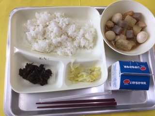 今日の給食は 関東煮 はくさいの甘酢あえ のりのつくだ煮 ごはん 牛乳 の献立でした。