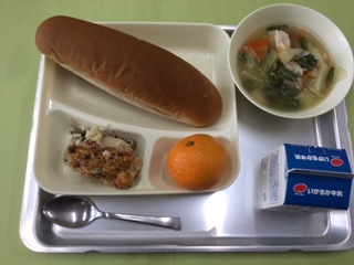 今日の給食は きのこのドリア 鶏肉とじゃがいものスープ煮 みかん 黒糖パン 牛乳 の献立でした。今日の給食委員会の放送はきのこのドリアに入っているエリンギについてです。