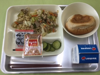 今日の給食は 和風焼きそば きゅうりのしょうがづけ いり黒豆 ハーフ黒糖パン 牛乳 の献立でした。和風焼きそばは簡単に言うと「だしじょうゆ味」の焼きそばということですが、ソース焼きそばとはちがったそれぞれのおいしさです。いろいろと工夫された献立に感謝です。