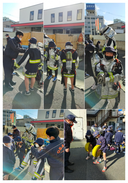 その後は一人ひとり、装備を着てみたり、本物の放水ホースを持ってみたりしました。総重量は30kgにもなるそうです。