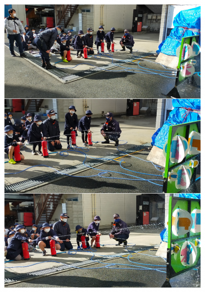 水消火器を使って、消化器の扱いも体験しました。みんな、うまくマトをめがけて放水しています。