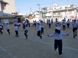?今日も15分休みに体力づくりのなわとび運動を行いました。2年生、4年生、6年生の番です。前とび、後ろとび、好きなとび方。運動委員が示すお題に従って休まずにとんでいきます。12月に入ってから今年度のなわとび運動を始めましたが、何回も練習をしてずいぶんと上達したように感じました。バネをきかして軽やかにとんでいる子がたくさんいました。