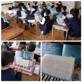 1年生の教室をのぞいてみると、鍵盤ハーモニカを使った「きらきら星」の合奏練習をしていました。先生の演奏に合わせて歌ってみて感じをつかみ、実際に鍵盤ハーモニカを吹奏します。5つのパートに分かれての学校を完成させていきます。練習に取り組んでいる姿を見て、春からずいぶんと成長したなとあらためて感じました。