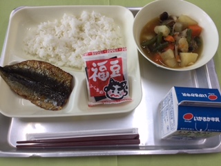 今日の給食は 節分の行事献立で いわしのしょうがじょうゆがけ 含め煮 いり大豆 ご飯 牛乳 の献立でした。