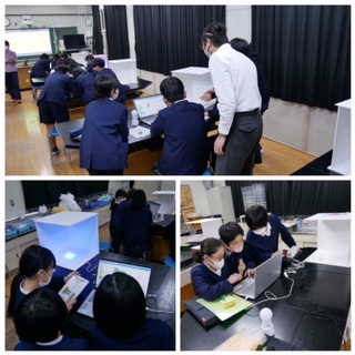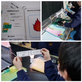 今日は5年生で、パナソニックさまから技術者の方をアドバイザーにお招きして力をお借りし、「光のプログラミング」の授業をおこないました。基本的なプログラミングの方法を確認した後、グループごとにテーマが与えられ、そのテーマに沿った光のオブジェを制作します。光の色、点滅の時間設定などをプログラミングして制御し、光の周囲をセロハンや綿、色紙、毛糸さまざまな材で補完していきます。