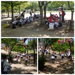 元浜緑地はたくさんの学校が遠足できていて子どもたちで大にぎわいです。わぁーっと遊具にかけ寄りたくさんたくさん遊びました。どの遊具もほかの学校の子もまじりあっていて姫島の子だけの写真をとりずらいので、わぁーっとかけだしたところだけです。楽しんでいる姿を思い浮かべてください。平和な時間です。