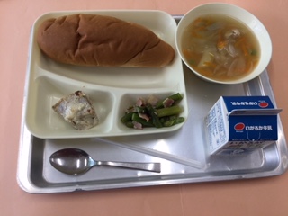 今日の給食は かつおのマリネ焼き(ノンエッグドレッシング) スープ グリーンアスパラガスのソテー 黒糖パン 牛乳 の献立でした。ノンエッグドレッシングは、卵アレルギーがあっても食べられるように工夫されたものです。毎日、みんなで美味しく食べることができる給食。それが理想です。