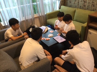 雨で朝の集いに出ることができないので9時の出発までに余裕ができました。朝食をはさんで洗面や荷物整理を終えた子は部屋での自由時間です。さっそくにこやかにカードゲームで遊んでいる子どもたちもいました。これもいい思い出です。