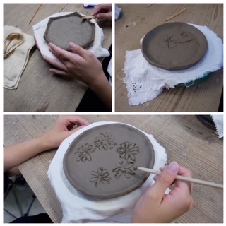 土をこねる始めると集中します。それぞれ自分のイメージを表現しようと頑張っています。得意な子もそうではない子もいると思いますが、どの作品にも味わいがあっていいです。どんな色に仕上げようか。釉薬を選びサインを入れました。焼き上がりが楽しみです。