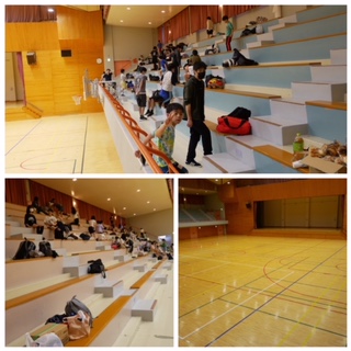 御坊市民体育館に落ち着きました。男子側と女子側に分かれて観覧席のスペースを避難スペースとして使用します。これから食料と水分を配布します。パンとおにぎりとジュース、さらにペットボトルの麦茶。足りない人にはいなり寿司もあります。突然の避難所となりましたが、子どもたちが元気なことには救われています。
