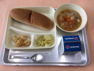 今日の給食は いか天ぷら フレッシュトマトのスープ煮 キャベツとコーンのソテー 黒糖パン 牛乳 の献立でした。フレッシュトマトのスープ煮のほどよい酸味がどんよりとした天候がつづきすっきりとしにくい身体をすっきりとさせてくれた気がします。