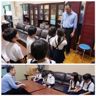 1年生たちが、校内のいろいろな先生に話をきいて、その仕事を理解するという学習活動をしています。校長室にもかわいいインタビュアーたちが来てくれました。