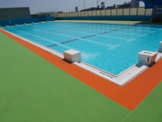 今シーズン、プールサイドが新しくなりました。日に焼けてやけどしそうに熱くなるコンクリートむき出しからきれいな緑色と茶色のラバーがコーティングされているプールサイドに変わりました。いい感じです。