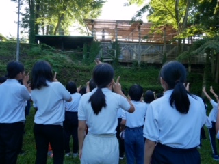 林間学習2日目の朝です。体調を大きく崩す子なし怪我もなし。今日も順調に活動を進めていきます。清々しい高原の朝です。雲ひとつない晴天です。カメラマンさんに全体写真を撮ってもらい体操を行いました。さあ、午前の活動は登山です。みんなで達成感を味わうぞ。