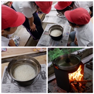 飯ごうのご飯が次々に炊き上がりました。不安に思いつつふたをあけると、おぉ、これは美味しそうです。お米は地元産のもの。期待できます。かまどの火には次はカレー鍋がかけられています。グツグツ。ああ、はやく食べたい。