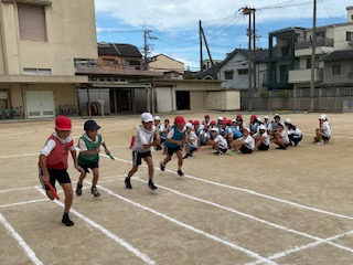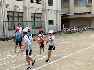 2学期が始まり3日目。ぼちぼちと運動会の練習を開始しています。写真は5年生のようす。走る競技のリレーをしてみました。バトンパスやリレーのルールなど、まだまだ練習したり確認したりすることが必要なことはたくさんありますが、一生懸命に力走する姿がとても良かったです。走るのが得意な子もそうでない子も、みんなが自分の精一杯の力で競技し、チームとしての完成度を高めてほしいです。
