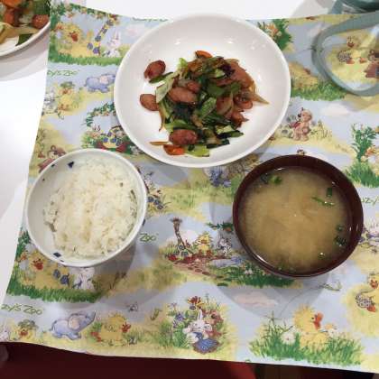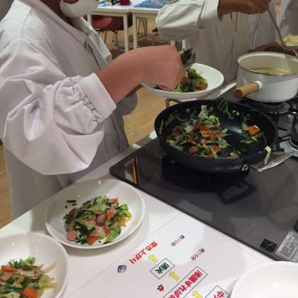 調理実習の開始。献立は、ごはん、味噌汁と野菜炒め