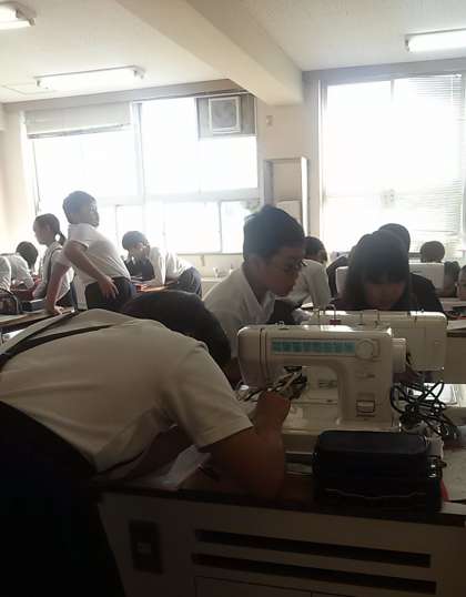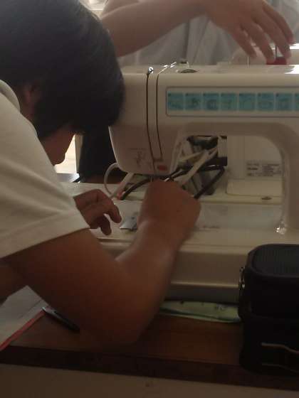 ミシンの実習です。今日は、上糸のかけ方と下糸の出し方の練習です。