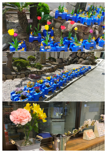 講堂に向かって伸びる庭園沿いの小道の方は3年生が昨年度に植えたビオラが満開です。