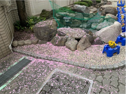 桜の花が散ってしまいましたが、地面を見ると花びらがピンクの絨毯のようです。登校時に気づいて「うわ、きれい」と呟く子どもの姿が見られました。