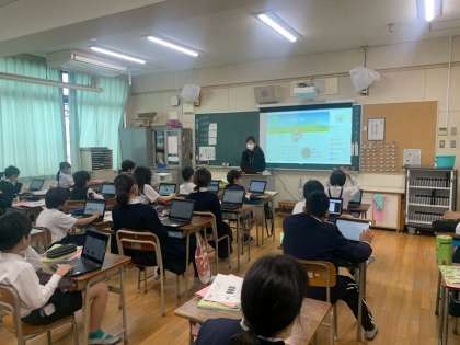 5年生の家庭科の授業では、タブレットを使って来週の「お茶の入れ方」の実習の準備をしていました。