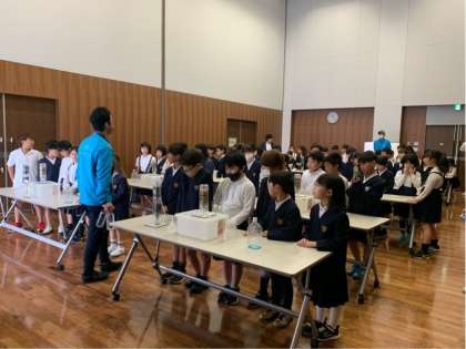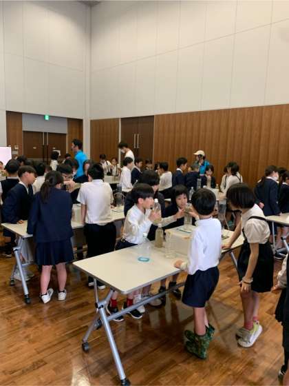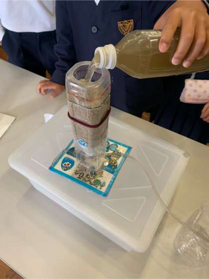 見学してことをもとに、班に分かれて実験をしました。ゴミで汚れた水がどんどんきれいになって行く様子がよくわかりました。